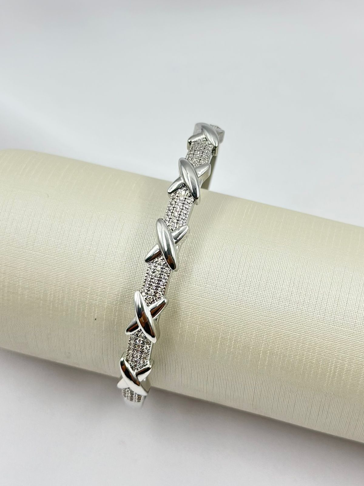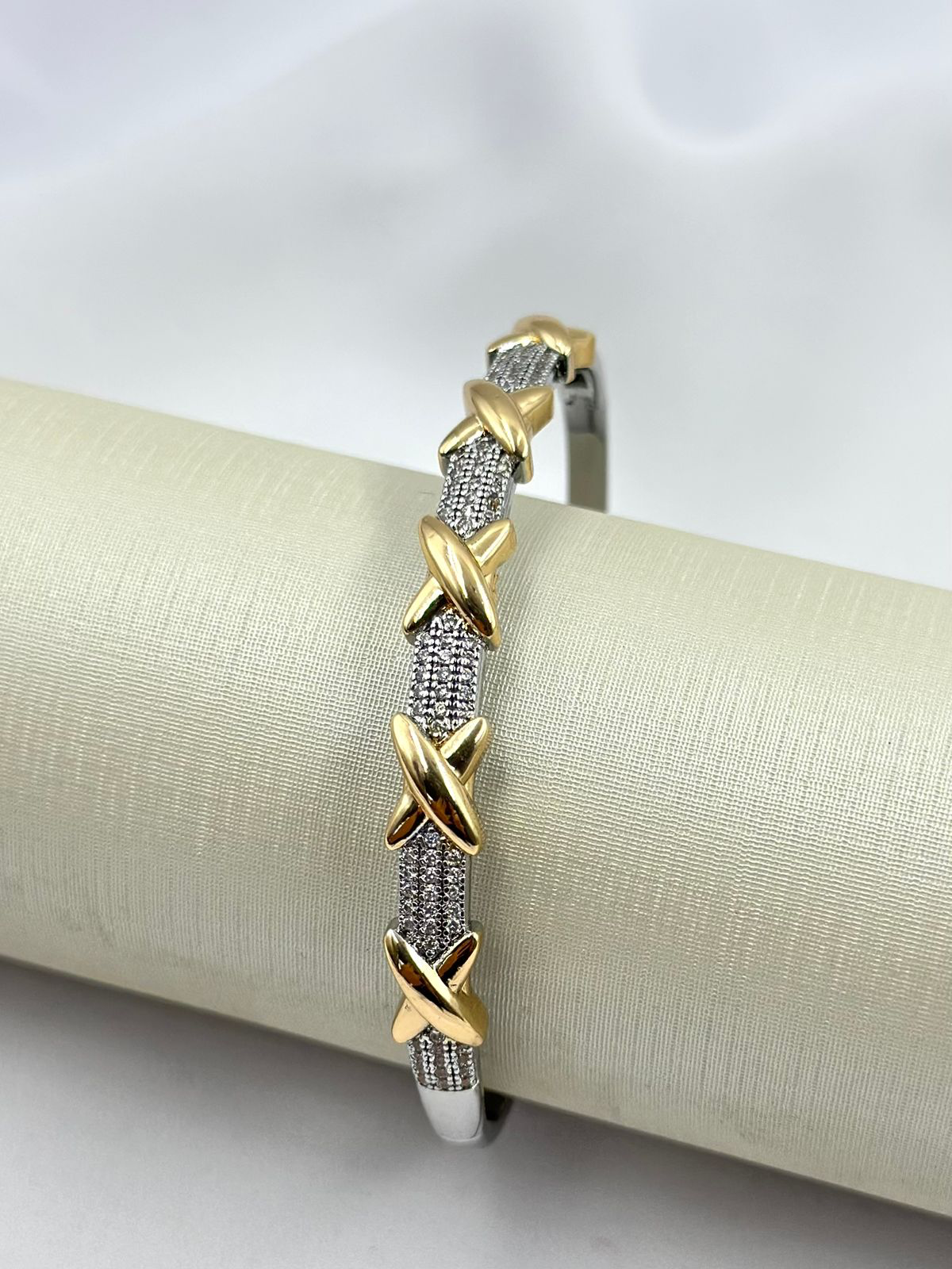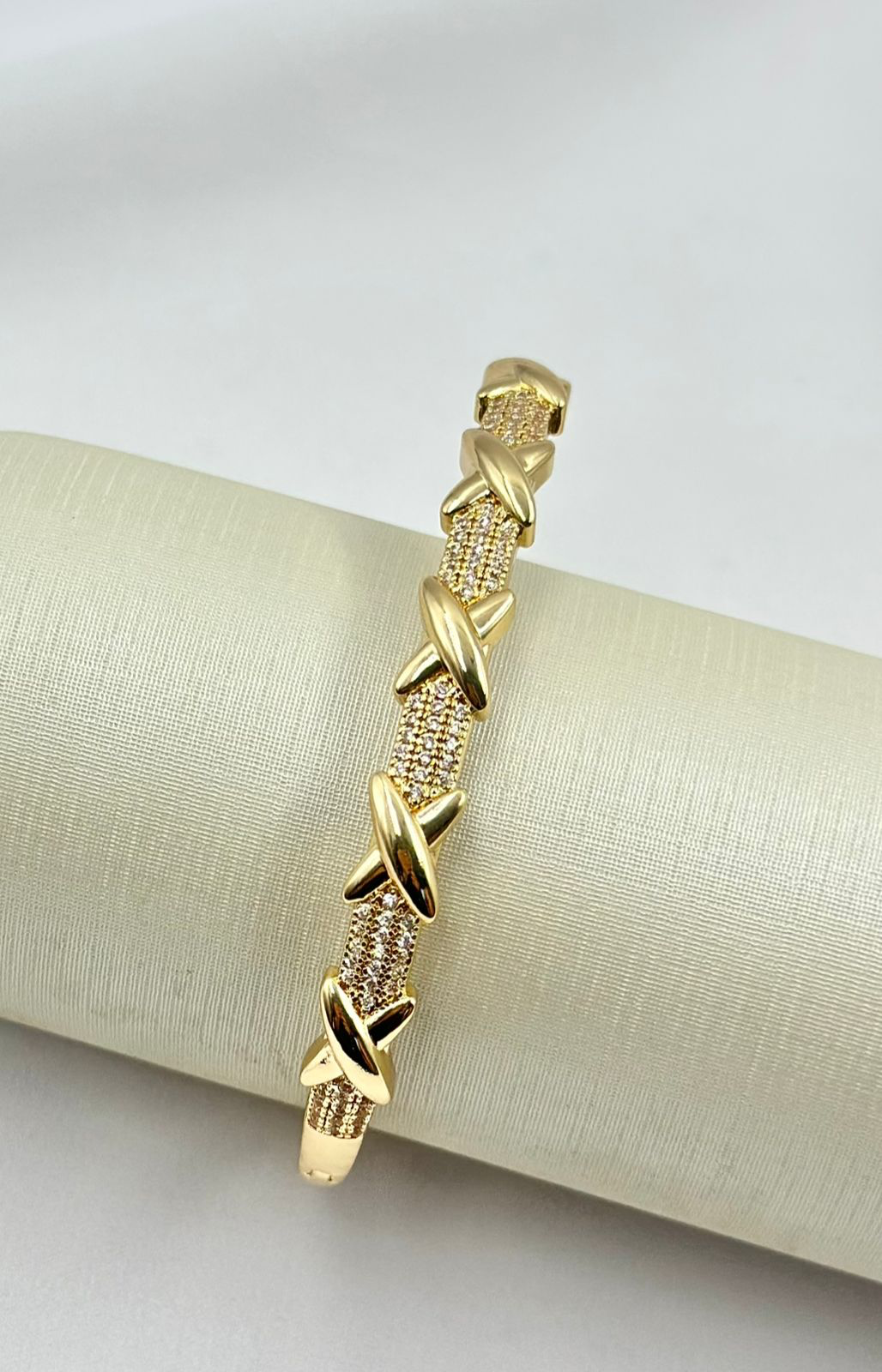 Bracelete cravejado com cinco x.