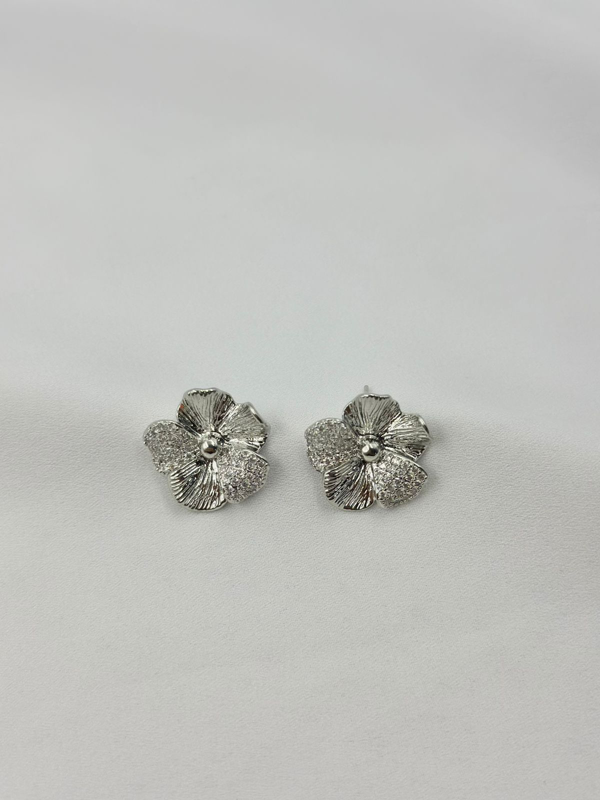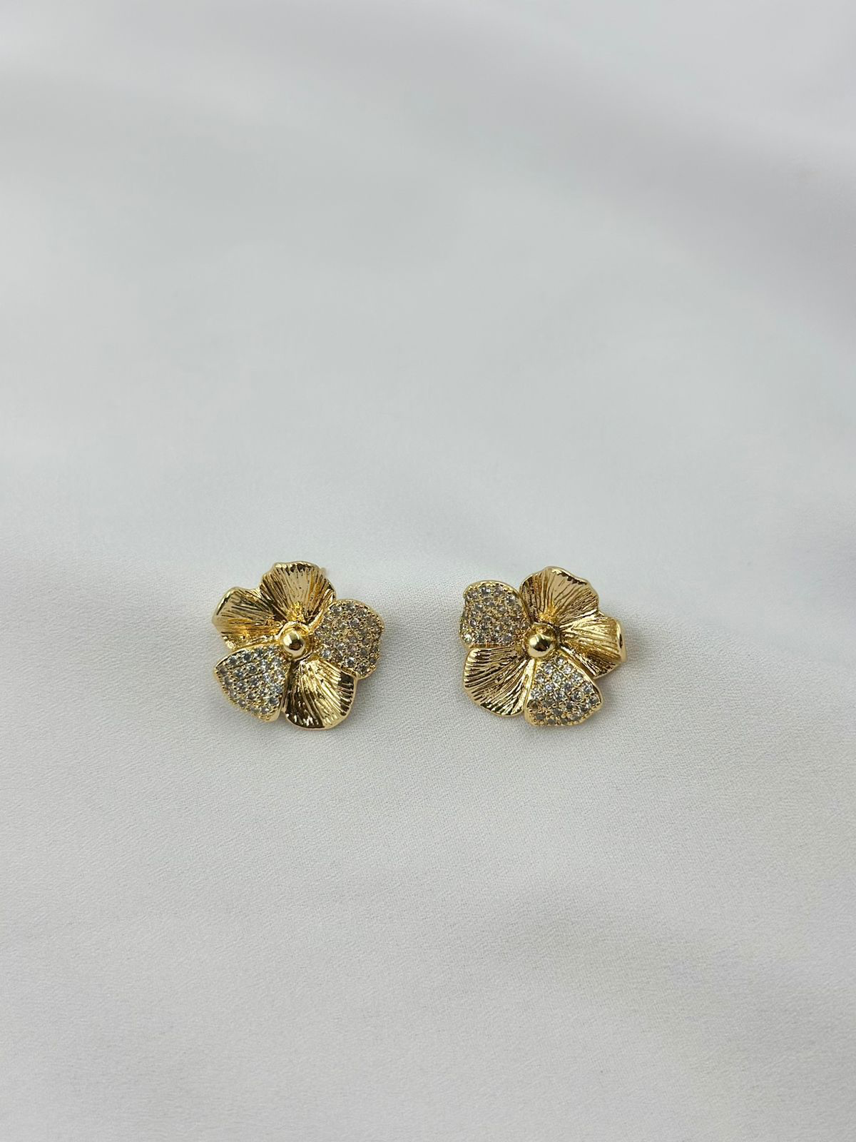 Brinco em formato de flor com duas pétalas cravejadas, dando alta satisfação.